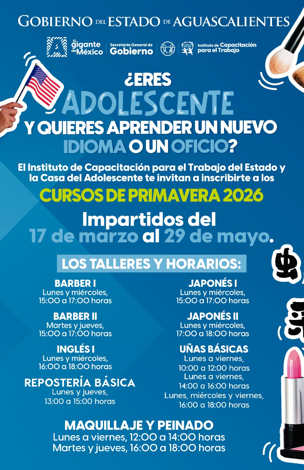 En coordinación con el Instituto de Capacitación para el Trabajo del Estado de Aguascalientes (ICTEA), se abrieron las inscripciones para los Cursos de Primavera 2026, que se impartirán de manera totalmente gratuita del 17 de marzo al 29 de mayo, el cupo es limitado.