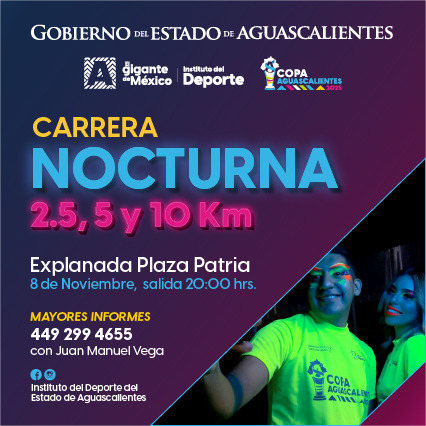 El Instituto del Deporte del Estado de Aguascalientes invita a la población hidrocálida a participar en la primera carrera nocturna de la Copa Aguascalientes, el torneo deportivo más grande del Gigante de México. Este evento se llevará a cabo el sábado 08 de noviembre.
