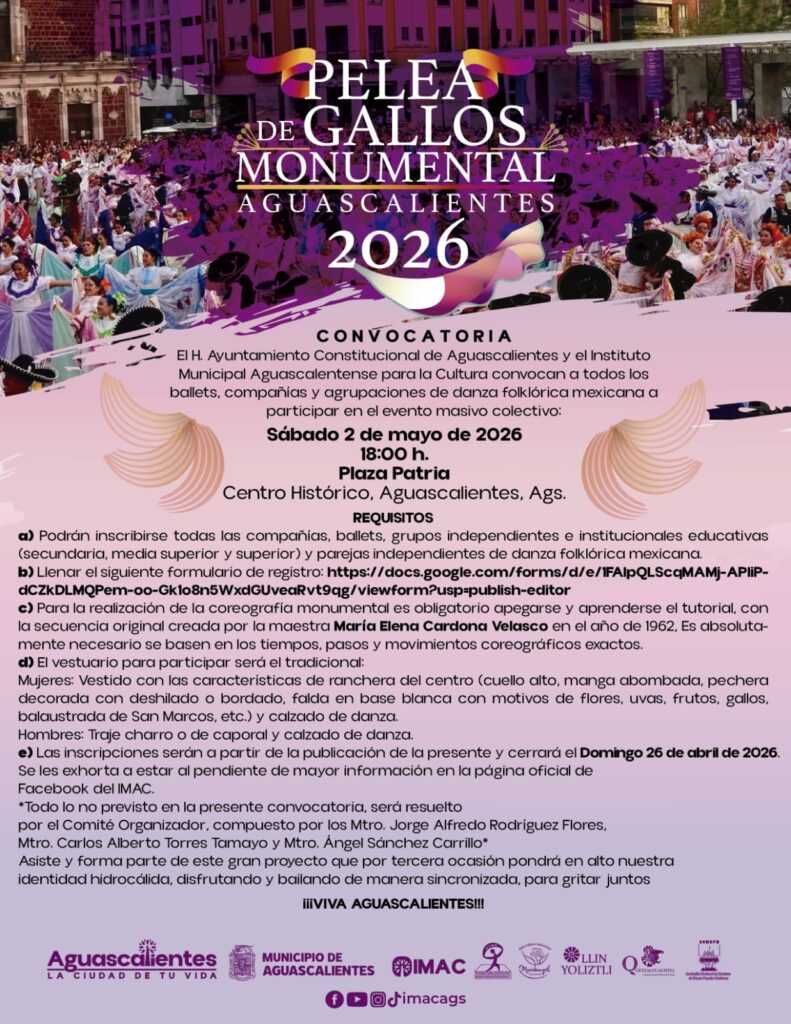 El Instituto Municipal Aguascalentense para la Cultura (IMAC) lanzó la convocatoria para participar en la Pelea de Gallos Monumental Aguascalientes 2026, encuentro masivo que reunirá a ballets, compañías, agrupaciones e instituciones educativas de danza folclórica mexicana en una de las expresiones colectivas más emblemáticas de la identidad hidrocálida.