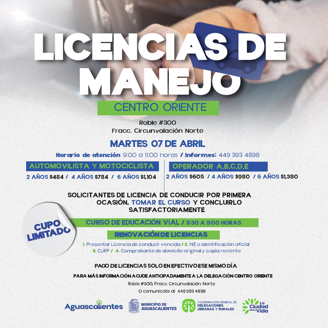 El Municipio de Aguascalientes invita a la ciudadanía a renovar la licencia de manejo, este próximo martes 7 de abril en las instalaciones de la Delegación Centro Oriente ubicada sobre la calle Roble #300 en el Fraccionamiento Circunvalación Norte.
