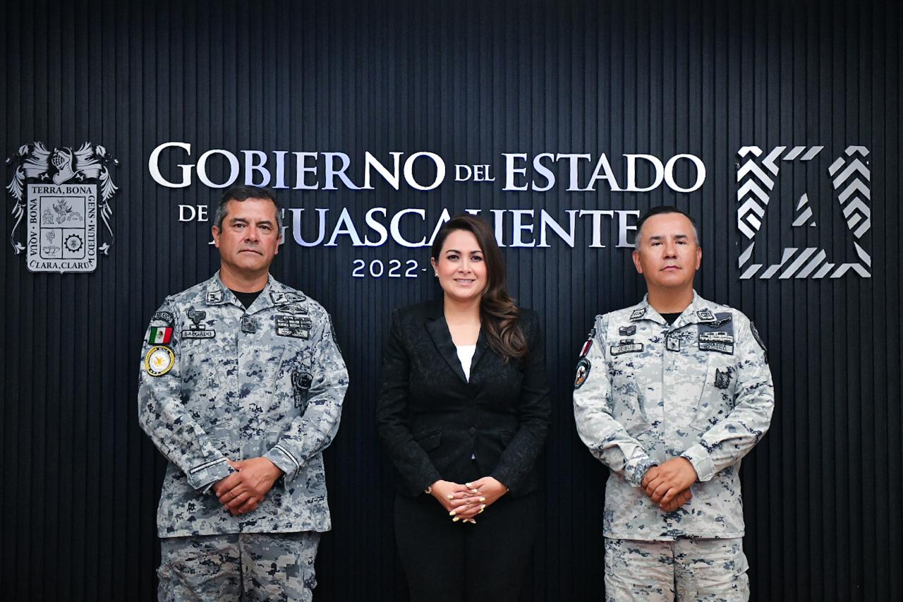 La gobernadora de Aguascalientes, Tere Jiménez, sostuvo una reunión con el general Alfredo Salgado Vargas, coordinador territorial de la Región III de la Guardia Nacional (Aguascalientes, Durango, Guanajuato, San Luis Potosí y Zacatecas), y con el general Isaac Aarón Jesús García, coordinador estatal en la entidad, para reforzar la coordinación interinstitucional y las estrategias de vigilancia en las carreteras de la región. El objetivo es garantizar traslados seguros para las y los visitantes a la Feria Nacional de San Marcos, así como mantener condiciones de paz y orden en este periodo de alta afluencia.