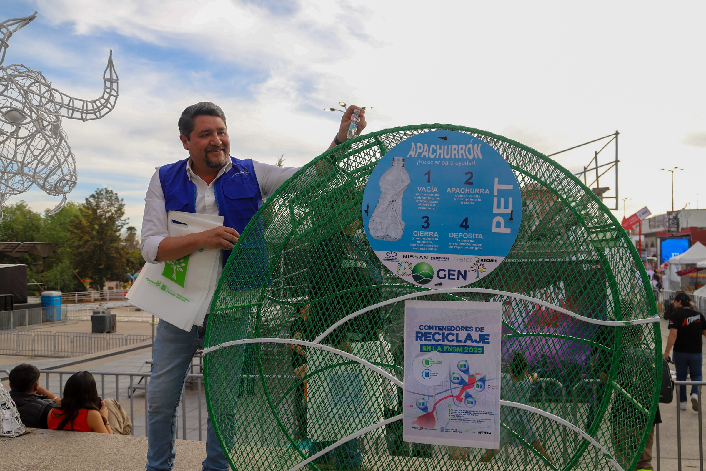 En el perímetro de la Feria Nacional de San Marcos se habilitaron cinco puntos estratégicos para la recolección de residuos, donde los visitantes podrán depositar materiales PET en botes verdes y desechos de aluminio en botes azules.